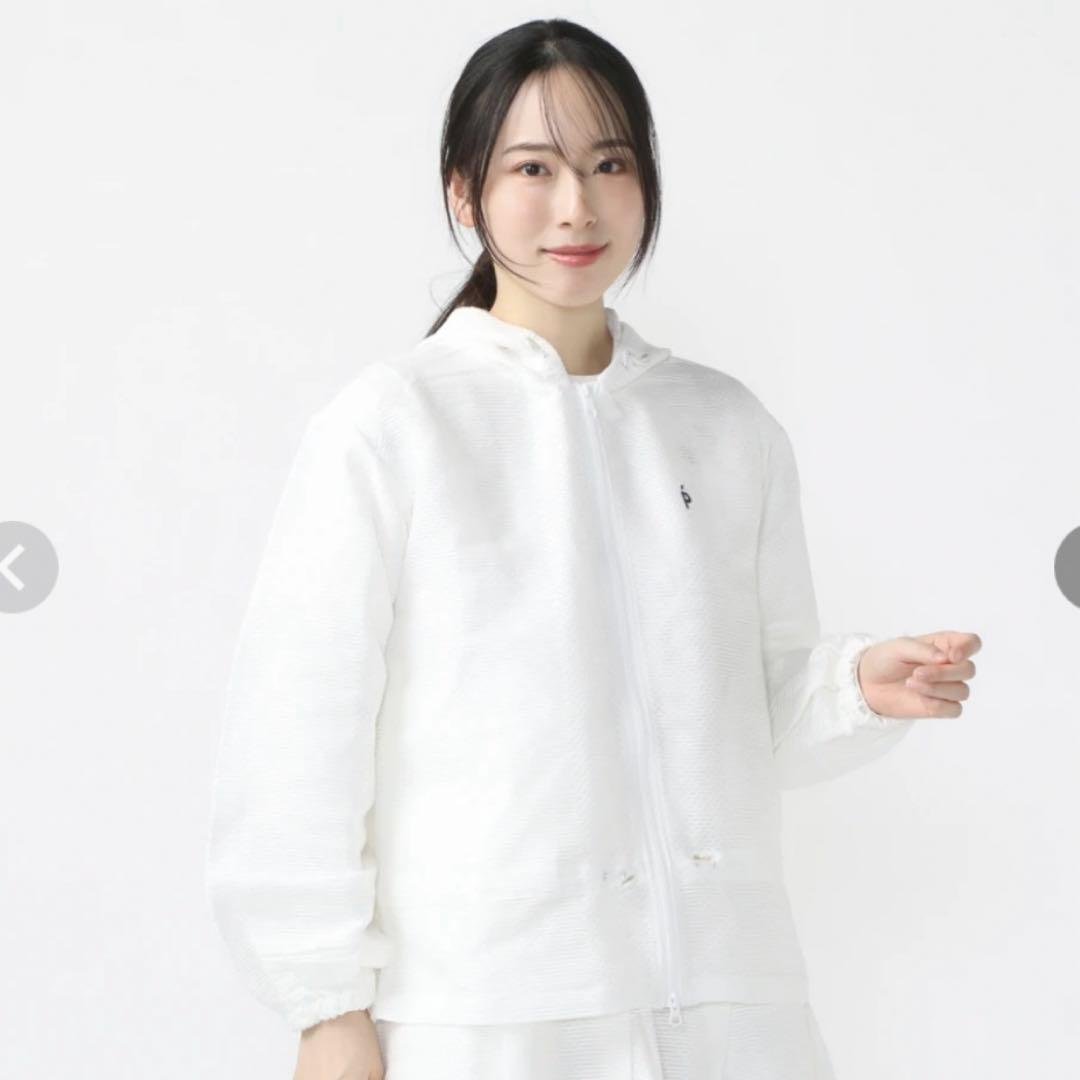 - 155cm 45kg で Sサイズを購入しました。オフィスでの着まわしの一つ(カーディのかわり)にしようと思いまして。だからあまりスポーツウエアっぽいのではなく、あくまでもお洒落なものをと思い、ナイキかpumaあたりでJKを探していたところ、行き着きました。オフィスで着るにも違和感なしで、ブラウスの上に羽織ってもレーシーでいい感じです。フードはもちろん収納したままにしてますが、襟もあるし、全体的にウエストも絞ってあるせいか、フォーマルと合わせてもいけます。サイズはジャストサイズでお尻が半分隠れる長さ。トレーニングに使うならワンサイズ上を買うかな。